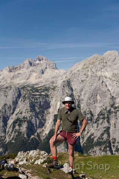 Made it to the pass. The next hut was down on the Via Alpina behind the rock outcrop (Dolic) with Triglav directly behind. Triglav is the highest mountain in Slovenia (2864m).
